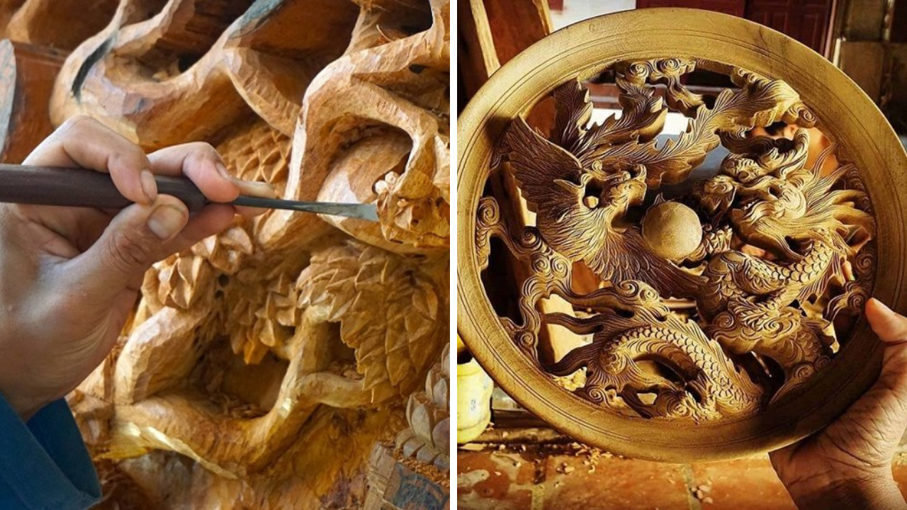• Đồ chạm khắc tại làng mộc Kim Bồng: Những món đồ chạm khắc tại Kim Bồng được làm tinh tế, tỉ mỉ và rất tinh xảo. Các món quà mộc mạc, độc đáo và mang đậm dấu ấn của Hội An xưa cũ. Bạn có thể mua các mặt hàng mỹ nghệ, câu đối gỗ, phù điêu, tượng trang trí về làm quà. Các món đồ chạm khắc có màu nâu óng ả đặc trưng và có được chạm khắc với nhiều kỹ thuật như chạm nổi, chạm thủng, chạm lộng. Bạn chỉ cần khoảng 120.000 – 300.000 VNĐ là đã có ngay một món quà cực ý nghĩa.